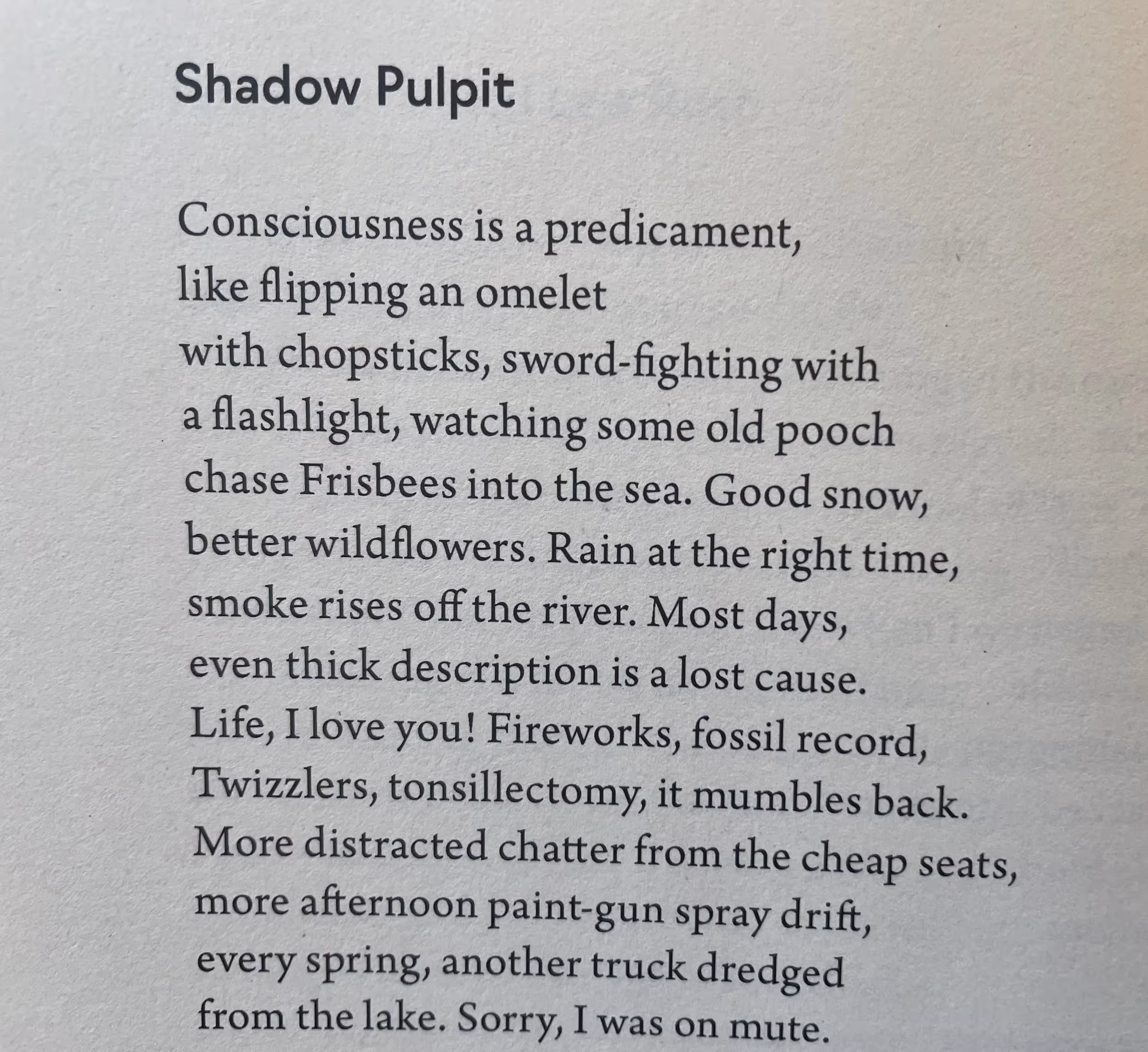 From the first line, patterns emerge to ground the reader in a peculiar sense of both being everywhere at once in the world and simultaneously of being trapped indoors. His varied observations of the sun’s relationship with his window, become an almost refrain throughout the book, with understated lines like, “Morning arrives, like a window salesman selling me / a view I already have” and “the sun falls through the window just so” and “the sun sets and the snow holds its breath.”