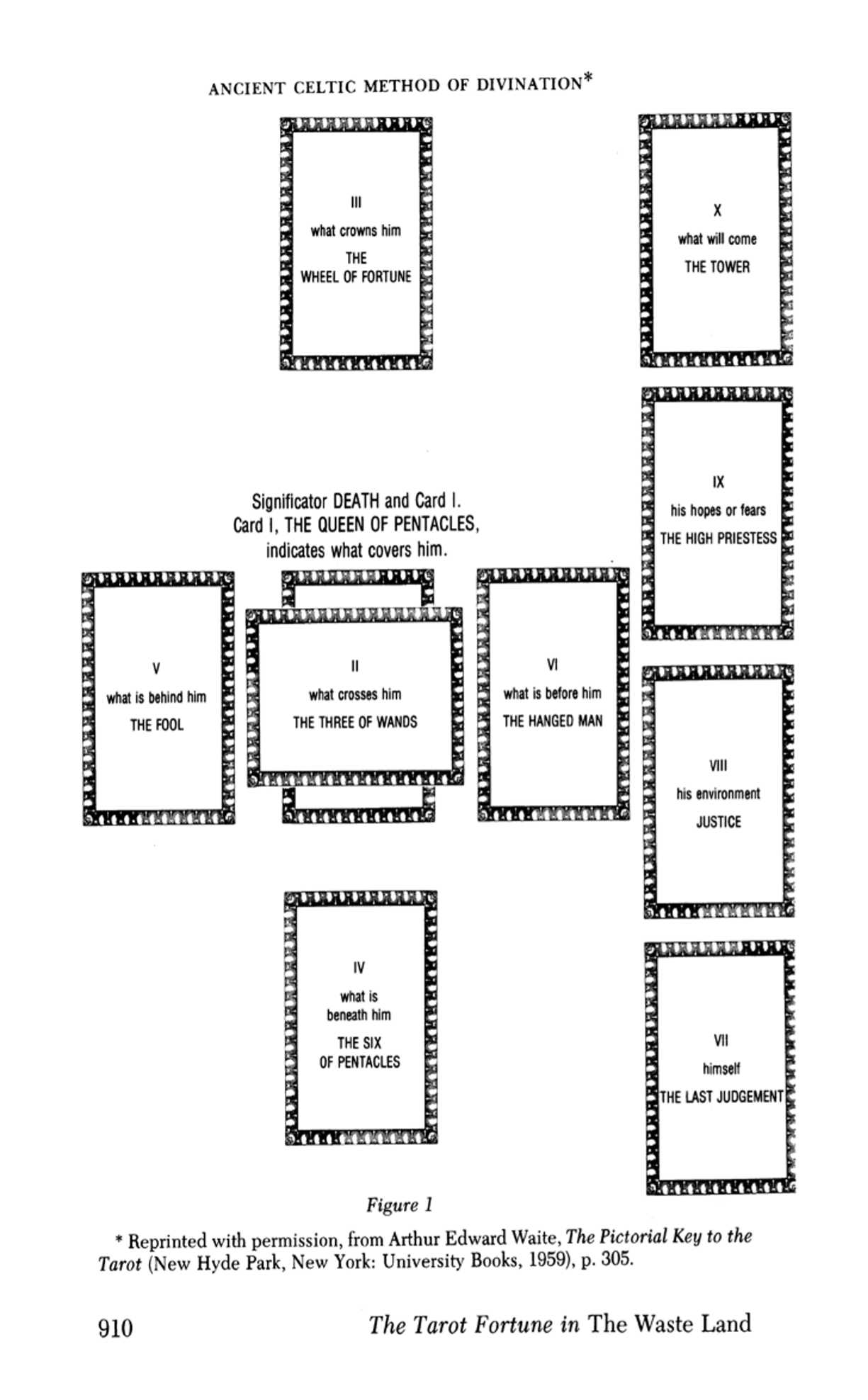 The Wasteland (1922) described what it was like to live post-WWI in London. The poem is separated into four parts, each with its own title. It has been argued by famous biographer Lyndall Gordon, in Elliot’s Early Years (1977),that “the poem is the ‘spiritual autobiography’ of its author who at this point in his life, stood in a profoundly problematic relationship to a Christian faith that he glimpsed still darkly, in the hazy glass of metaphysics and mysticism” (Gordon). From the depressive imagery and melancholic characters, it is believed that the poem relies heavily on the preparation and desire for death. During the time the poem was written, many lives had been lost due to the war. The apocalyptic setting mirrors the reality of the times and raises questions about the afterlife. The Protagonist, symbolizing everyman, is a character of many guises. At one point, he is the Fisher King of the Arthurian Grail legend. In another, he is Tiresias, the same blind prophet from the Greek tragedy. One would almost call this main character somewhat of an anti-hero, waiting for creeping death in the described apocalyptic landscape. However, all hope is not lost. In one instance, the protagonist seeks advice from a mystic in hopes of revealing a better future. He receives a full Celtic cross spread tarot reading. It’s easy to miss the one-on-one divination session, as it is only one scene in a larger story, but with further analysis of The Wasteland and some research into Elliot’s views on the occult, the fortune-telling scene weighs in on the author’s involvement in esoteric practices and his declining faith in Christianity.