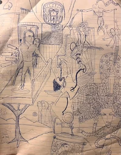 You may be wondering, as am I: What kind of venue would say “yes” to a poem of such “quality”? And furthermore: what was wrong with the person who wrote it? The time? 1992. The place? A Seventh-day Adventist boarding school in north Georgia. The situation: boys in one dorm, girls in another, soy meat entrees in the vegetarian-foods-only cafeteria, chapel twice a day, lots of songs about meeting your fellow students in heaven. No dancing, no rock and roll, no Dungeons & Dragons, no TV, no competitive sporting events. (Not to mention that vampires—and really all depictions of the undead—would have been sorely frowned upon.) Despite these deprivations I was not, I don’t think, depressed. Or maybe I was, a little. More likely: I wanted to be, back when I’d use an erasable pen to sear funereal Cure-like dirges about blood and knives and skeletons into the plastic interior of my Trapper Keeper folders, or draw—as the corresponding image proves—melodramatic collages of sensationalized despair that might include a goth-style guitarist; leafless, many-limbed trees; an open mouth with the kind of perfect teeth I’d seen a thousand times on models in my father’s dental office; arms reaching out of walls made of liquid; a skeletal hands emerging from a grave; a many-limbed woman with a storm of frizzy hair.