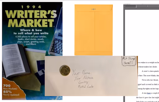 There was only one thing to do after receiving a rejection: return to the Writer’s Market, pore over their listings, and circle the names of journals who, according to their descriptions, welcomed “new writers” but not “simultaneous submissions.” I didn't know why magazines had such an aversion to simultaneity, didn’t know that they said this as a way to decrease the amount of submissions they received. Had no idea that literary magazines were notoriously understaffed and that the employees were overworked and underpaid and that the offices of these magazines and journals were piled with envelopes and paper and that there was no secret list that identified people as simultaneous submitters because that would be like piling a trillion more hours of work onto everything else they had to do and everyone was backlogged and a deluge of mail was pouring in by the minute.