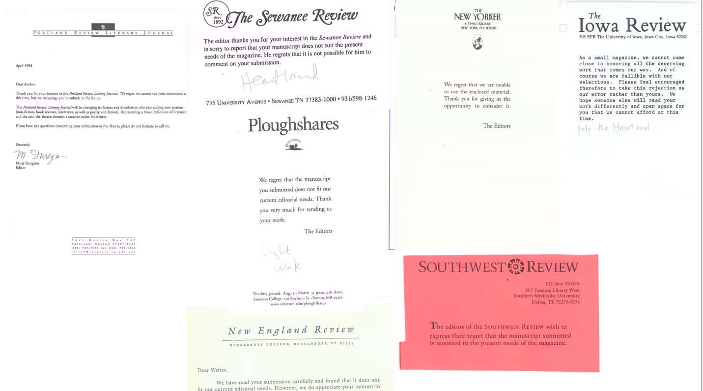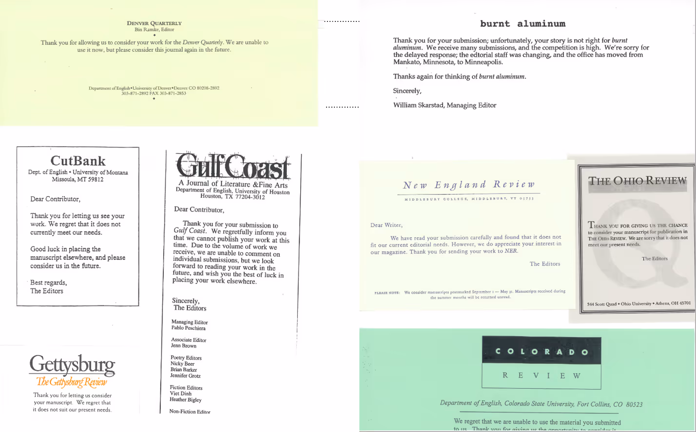 It was, of course, disheartening to unfold a slip of paper upon which a version of the following had been typed: “We regret to inform you that this material does not suit our needs at this time. We wish you the best in placing it elsewhere.” Oh! Sweet Elsewhere! That elusive country it took me so long to find! I hunted it for years, slinging my stories—and sometimes my poems—into the void, hoping that someday I’d land on its shores. In the meantime, I received a slurry of paper: rectangular slips of various widths and lengths and colors, bearing the insignias and titles of magazines in their identifiably distinguished fonts, which hovered above brief paragraphs that said things like: “We have read your manuscript with interest” (Carolina Quarterly) and “Thank you for sending us your writing” (The Threepenny Review) and “Thank you for your interest” (Portland Review). This gratitude—supposing gratitude was expressed—was always followed by a coordinating conjunction or a conjunctive adverb that allowed the message to swerve towards regret. “We regret that it does not currently meet our needs” (CutBank). “Unfortunately your story is not right for burnt aluminum.” Flyway regretted that their space was limited. Other magazines cited a “backlog of material” and explained that they were receiving so many submissions that it would be impossible to reply more specifically.
