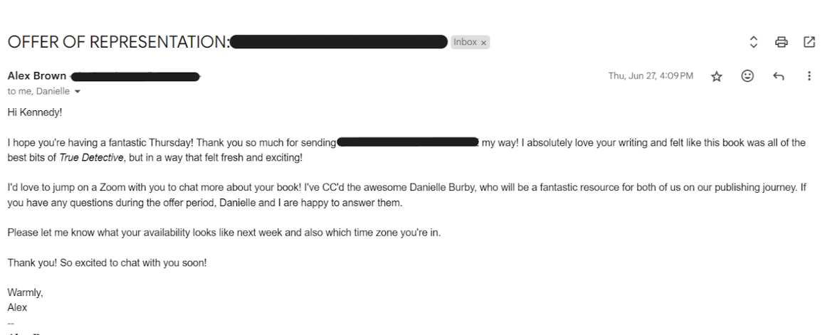 On Monday, June 5th, I sent two more query letters, one of which was to Alex Brown. I’d been planning to query her for a while, and when her inbox opened I sent it in. On Wednesday, June 7th, I received my second full request, this time from Alex. I sent more queries during the month of June—one of which became a partial, which then became a full the next morning—but the real news was my offer of representation from Alex on June 27th.