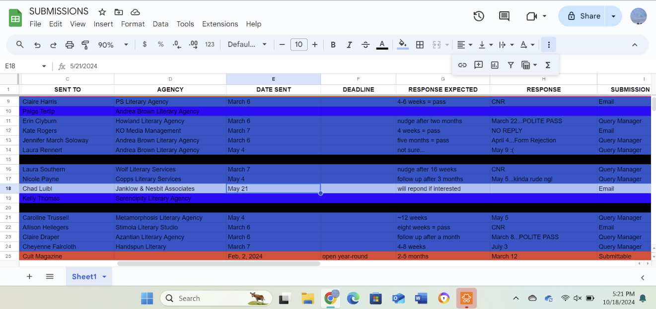 Research. Research, research, research. I had compiled a long list of agents who might be interested in my manuscript long before I sent my first batch of queries. Manuscript Wishlist was my primary source, but if you’re looking for agents, also check out Query Tracker and Twitter—or X, if you’re swine. These are necessary for getting to know the agents you're querying because each letter should be personalized. For updates on agent deals and to learn about what books are currently selling, Publishers Marketplace is also a great tool to use while building your list. I selected agents to query based on the genres they represented, the details on their wishlist such as character elements and settings, whether our personalities aligned, their website information, their social media presence, and their general response time. I kept every detail in a Google Sheets file, which helped me track who I was querying, each agency I was reaching out to (so I wouldn’t send more than one letter per agency), and their general response times. Doing this was necessary for my mental health during this process.