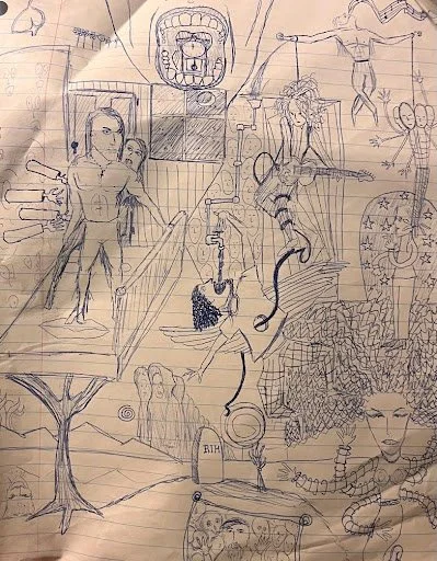 You may be wondering, as am I: What kind of venue would say “yes” to a poem of such “quality”? And furthermore: what was wrong with the person who wrote it? The time? 1992. The place? A Seventh-day Adventist boarding school in north Georgia. The situation: boys in one dorm, girls in another, soy meat entrees in the vegetarian-foods-only cafeteria, chapel twice a day, lots of songs about meeting your fellow students in heaven. No dancing, no rock and roll, no Dungeons & Dragons, no TV, no competitive sporting events. (Not to mention that vampires—and really all depictions of the undead—would have been sorely frowned upon.) Despite these deprivations I was not, I don’t think, depressed. Or maybe I was, a little. More likely: I wanted to be, back when I’d use an erasable pen to sear funereal Cure-like dirges about blood and knives and skeletons into the plastic interior of my Trapper Keeper folders, or draw—as the corresponding image proves—melodramatic collages of sensationalized despair that might include a goth-style guitarist; leafless, many-limbed trees; an open mouth with the kind of perfect teeth I’d seen a thousand times on models in my father’s dental office; arms reaching out of walls made of liquid; a skeletal hands emerging from a grave; a many-limbed woman with a storm of frizzy hair.